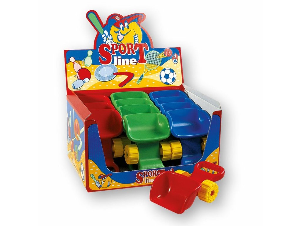 Dvoukolový nakladač na písek s rukojetí. Velmi pevná, kompaktní hračka oblíbená zejména ve školkách. Vyrobeno v Itálii z kvalitních plastů. Mix 3 barev. Prodej pouze celého displeje, který obsahuje 12 kusů.