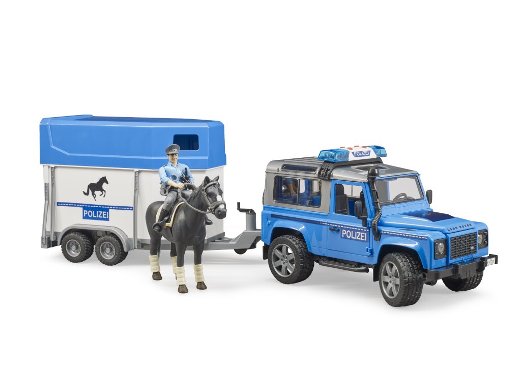 I v Bruder světě je potřeba dohlížet na dodržování zákonů a to zajistí např. sada Bruder 02588 Policejní Land Rover s přepravníkem na koně, policistou a figurkou koně.