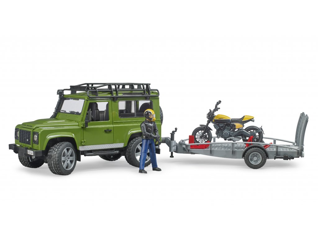 Bruder 02589 Land Rover s motocyklem Ducati Scrambler a řidičem