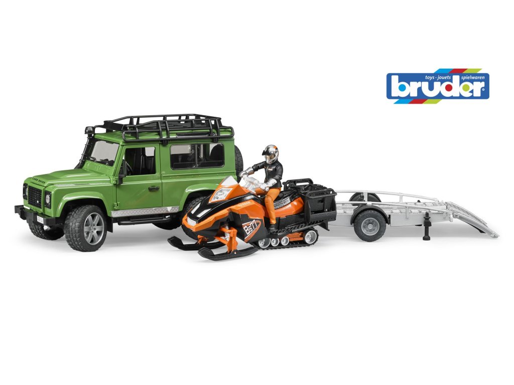 Bruder 2594 Land Rover s valníkem, sněžným skútrem a figurkou je novinkou roku 2015 v sortimentu Bruder. Věrná kopie vozu Land Rover s rezervním kolem na zadních dveřích, demontovatelnými zadními sedačkami a otevírací kapotou motoru s pohledem na detailně propracovaný motor. Součástí balení je valník pro přepravu skútru, figurka řidiče a sněžný skútr.