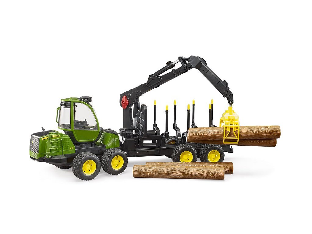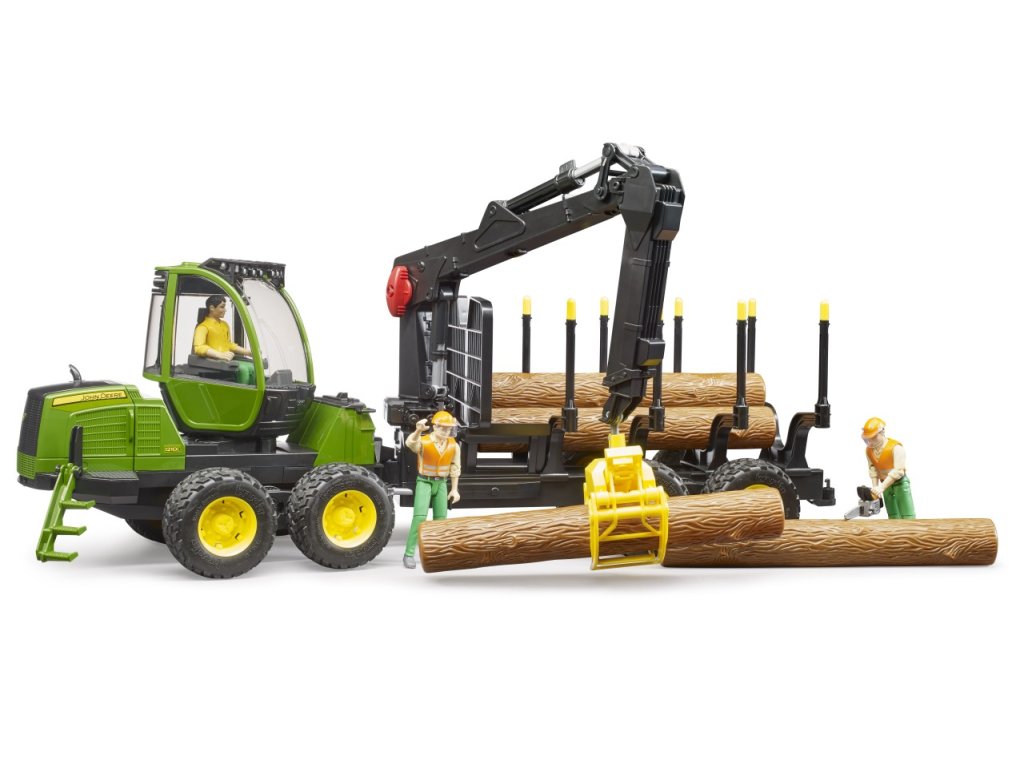 Disponuje otočnou prosklenou kabinou, otevíracími dveřmi a otevíracím krytem motoru, sklopnými schůdky, plovoucí nápravou, která zdolá bez problému každý těžký terén a prostorným přívěsem na dřevo, který je vybaven otočným nakladačem s drapákem, zadním návěsem a 4 ks kulatiny. Přepravník na dřevo JOHN DEERE je kompatibilní s figurkami BRUDER bworld, díky kterým dotvoříte skutečnou práci v lese.