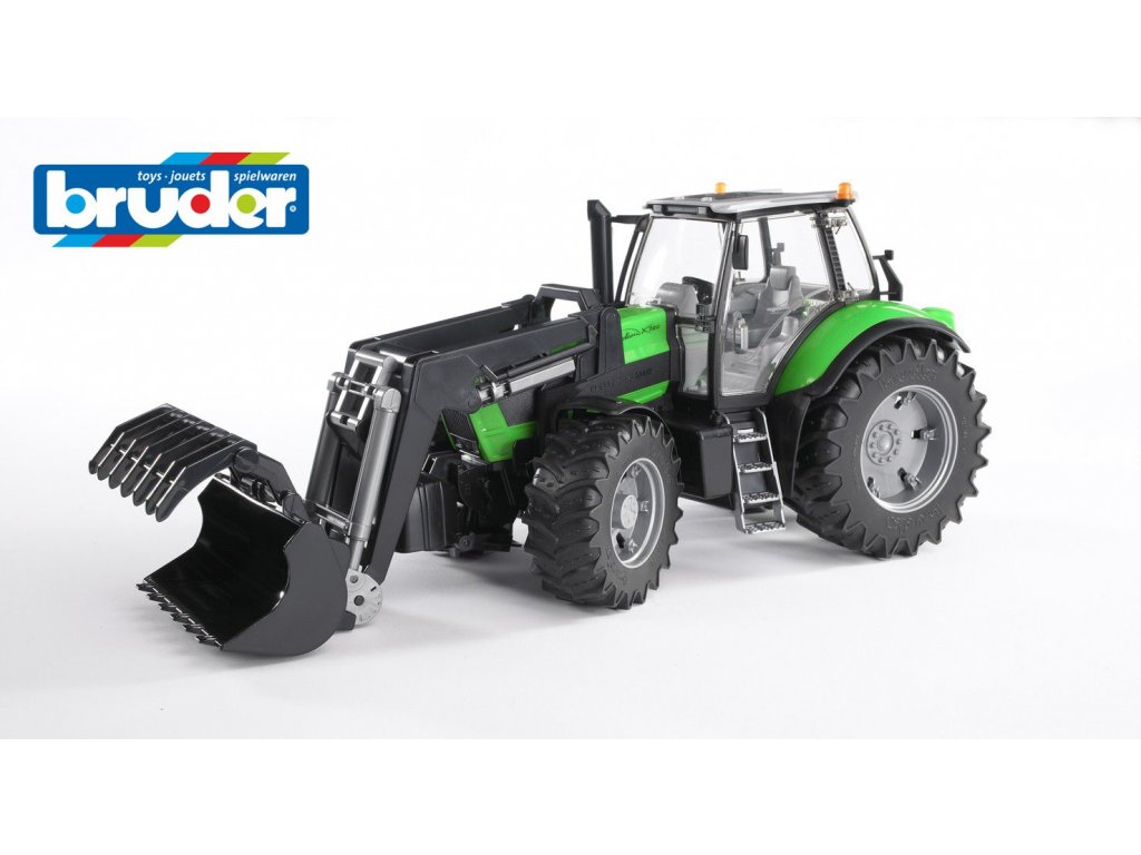 BRUDER 3081 - Traktor Deutz Agrotron s čelním nakladačem. Velmi detailně propracovaný model traktoru s otvíratelnými dveřmi, tažným zařízením, s nastavitelným zdvihacím mechanismem, otvíratelnou kapotou, odnímatelným hydraulickým zařízením vpředu a navíc s čelním nakladačem. Traktor Deutz Agrotron je řiditelný pomocí přídavné řídící tyče skrz posouvatelnou střechu.