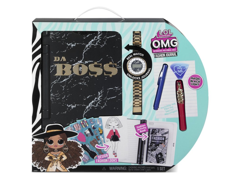 Svoje nejtajnější myšlenky a módní návrhy schovej v elektronickém OMG Módním deníku, který odemkneš pomocí tajných hodinek. Deník obsahuje vzory pro módní návrhy, fix na tajné zprávy a přehrává hudbu!
