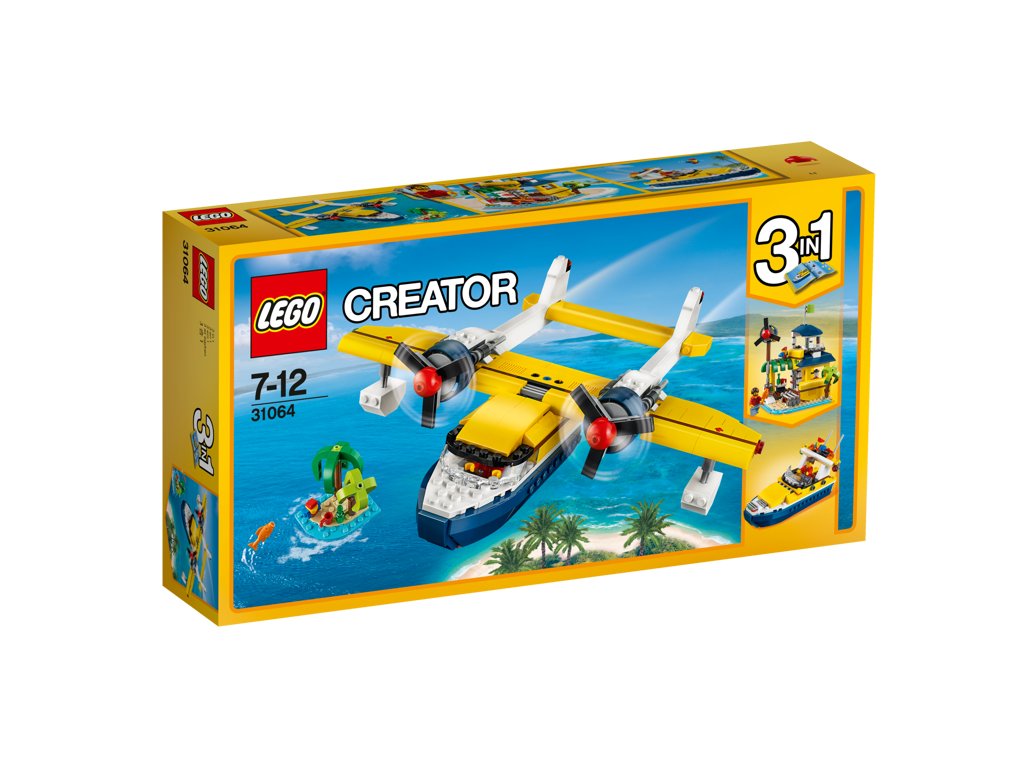 Vydej se do exotických míst v obrovském hydroplánu, které má dva motory s otáčejícími se vrtulemi, dva ocasy, upravitelnou výškovku, přistávací plováky, otevírací nákladní prostor a kokpit s detailní přístrojovou deskou. Součástí je také tropický ostrov se dvěma palmami, navíc prázdná lahev s mapou. Tento model LEGO® Creator 3 v 1 lze přestavit na Chatrč na ostrově nebo na Rychlý motorový člun. Obsahuje minifigurku.