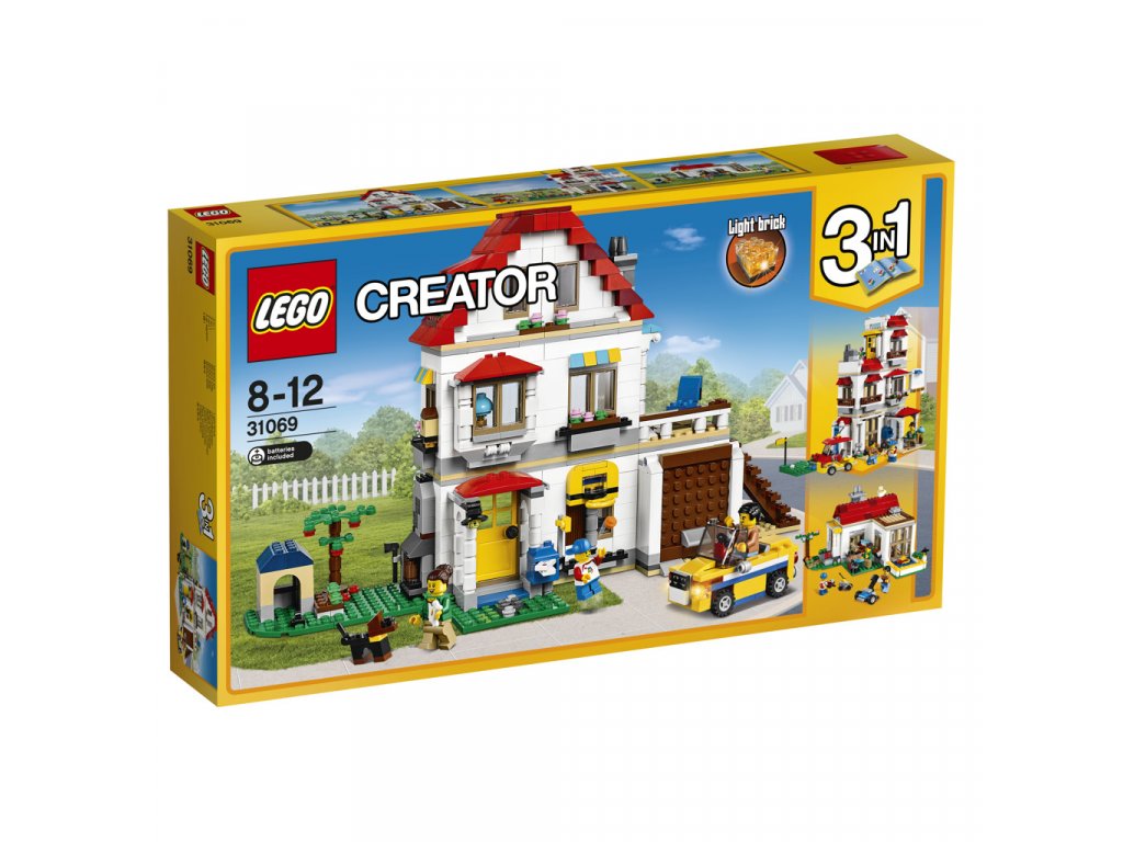 Užívej si městská dobrodružství v třípatrové Rodinné vile, která obsahuje střechu s červenými taškami, bílou fasádu se spoustou oken a barevných detailů, navíc prostor zahrady s basketbalovým košem, venkovním ohništěm, poštovní schránkou, psí boudou a schodištěm vedoucím na terasu s lehátkem. Detaily interiéru zahrnují ložnici a kuchyni, stoly a pohovku. Sestavitelné sekce různě kombinuj a jednoduše prohazuj okna, dveře a další části a upravuj tak svůj dům pomocí LEGO® Creator modulárního systému, který je novinkou pro červen 2017. Zkombinuj tuto sadu se sadami 31067 a 31068 a postav dům snů s nekonečným množstvím možností pro stavění i hraní! Tento model LEGO Creator 3 v 1 lze přestavět na Golfový hotel nebo na Letní vilu s plaveckým bazénem. Součástí jsou tři minifigurky.
