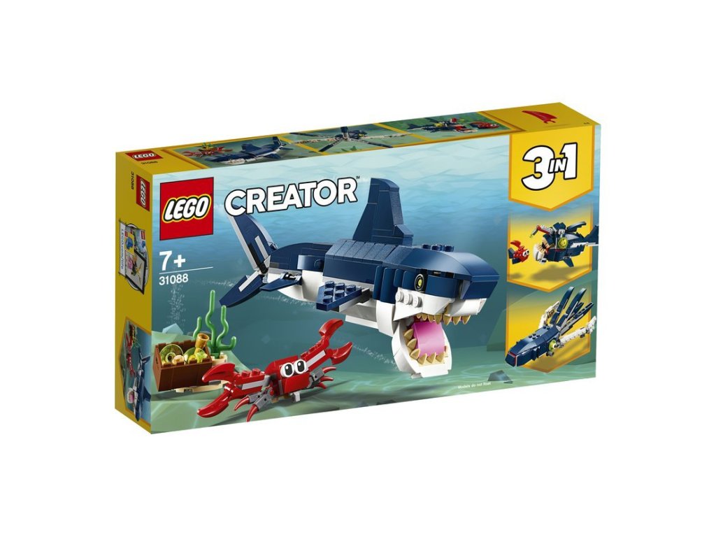 Vychutnej si dobrodružství mořského života se sadou 31088 Tvorové z hlubin moří od LEGO® Creator 3 v 1, která obsahuje děsivého žraloka s realistickou kombinací tmavě modré a bílé barvy, otevírací tlamou plnou špičatých zubů, hýbajícími se ploutvemi, pohyblivými klouby a reflexníma očima, a k tomu navíc pohyblivého kraba s truhlou s pokladem. Sady od LEGO® Creator 3 v 1 ti nabízí 3 různé stavitelské a herní zážitky. Postav žraloka a kraba a přestav je na pohyblivou oliheň nebo ďasa mořského s širokou tlamou a užij si ještě víc zábavy v hlubinách moře.