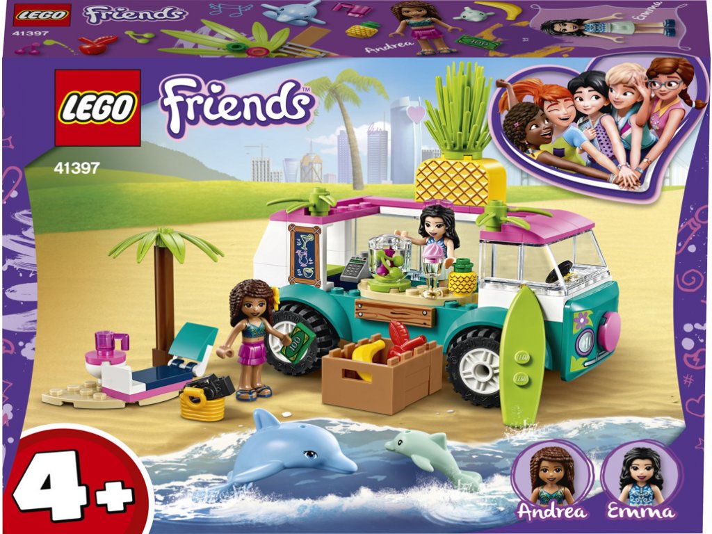 Tato sada Pojízdný džusový bar (41397) obsahuje pláž, LEGO® Friends minipanenky Emmu a Andreu a 2 figurky delfínů. Sady pro děti starší 4 let pomáhají rozvíjet sebedůvěru při stavění skrze jednoduché stavební kroky.