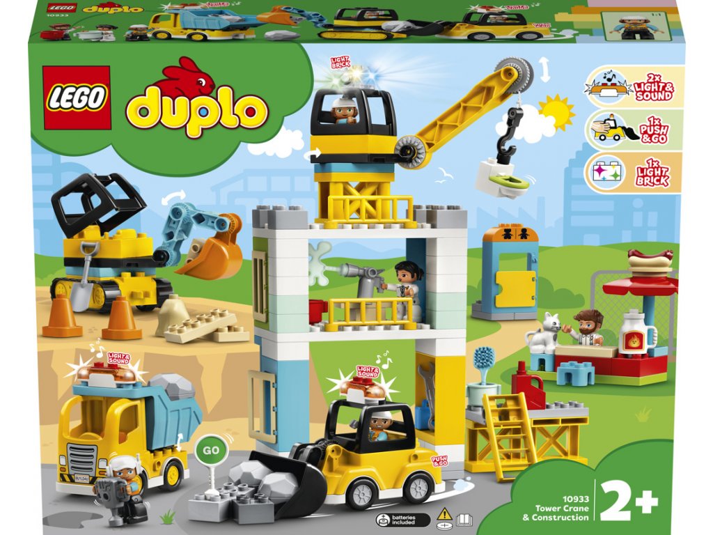 Stavebnice pro předškoláky LEGO® DUPLO® Stavba s věžovým jeřábem (10933) přináší pestrou škálu strojů, činností a postav, které inspirují k přehrávání příběhů a rozvíjení dovedností. Stavebnice s neomezenými herními možnostmi Na staveništi plném funkcí a doplňků budou mít děti neustále co objevovat. Velký buldozer, mini buldozer, náklaďák se sklápěčkou, bagr a jeřáb dávají dětem a rodičům příležitost společně vozit materiál, stavět věž a vyklízet sutiny z ulic. A když je čas na oběd, dokonce můžete zaskočit do stánku s párky v rohlíku! Pestrá stavebnice plná doplňků Díky pěti moderním postavičkám – malířce, jeřábnici, 2 dělníkům a chlapíkovi s párkem v rohlíku – a spoustě parádních doplňků, jako jsou světelné a zvukové kostky a buldozer, který stačí potlačit a pojede, nabízí stavebnice spoustu možností, jak zabavit, inspirovat a uchvátit představivost dětí. Pro ještě více herních možností můžete sadu nakombinovat s dalšími stavebnicemi LEGO DUPLO.