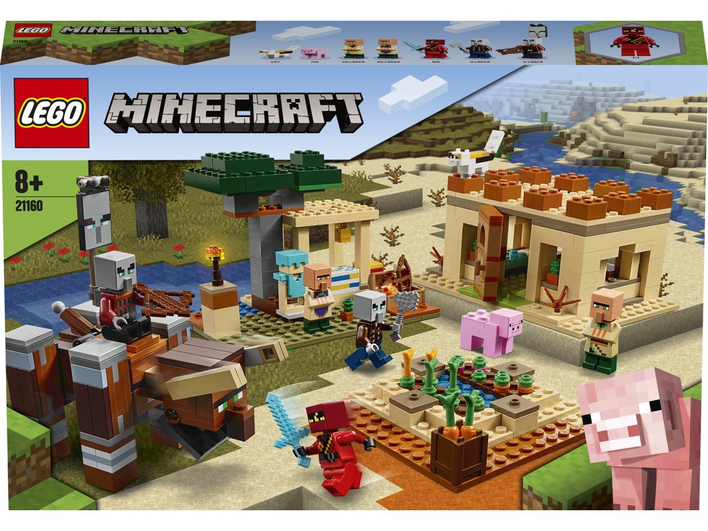 Akční dobrodružství ze světa LEGO® Minecraft™ v inspirativním prostředím, s parádním příslušenstvím a oblíbenými postavami z populární videohry. Když záhadný Kai přispěchá na pomoc do boje proti nepřátelským nájezdníkům, může se stát cokoliv! Děti objeví nespočet způsobů, jak stavět, hrát si a tvořit! Tři známá místa z Minecraftu – pouštní domek s plochou střechou, obchod a pole s úrodou – dávají hráčům nevyčerpatelně mnoho možností, jak model přestavovat pro své příběhy. Sundejte střechu domu a hrajte si v interiéru. Ve stavebnici najdete přátelské vesničany, Pillagery, kteří jsou novinkou pro leden 2020, Vindicatora, spoustu zvířátek a doplňků, a k tomu všemu i úžasného kousavého Ravagera. Je dost velký, aby se na něj dala posadit figurka, a má nebezpečnou otevírací tlamu! Zažijte Minecraft ve skutečném světě s LEGO kostkami a figurkami! Stavebnice LEGO Minecraft dětem otevírají svět neomezené kreativity, ať už si budou hrát samotné nebo s kamarády či rodinou. A až malí stavitelé popadnou sestavitelné figurky, které jsou novinkou pro leden 2020, těžko je od hraní odtrhnete!