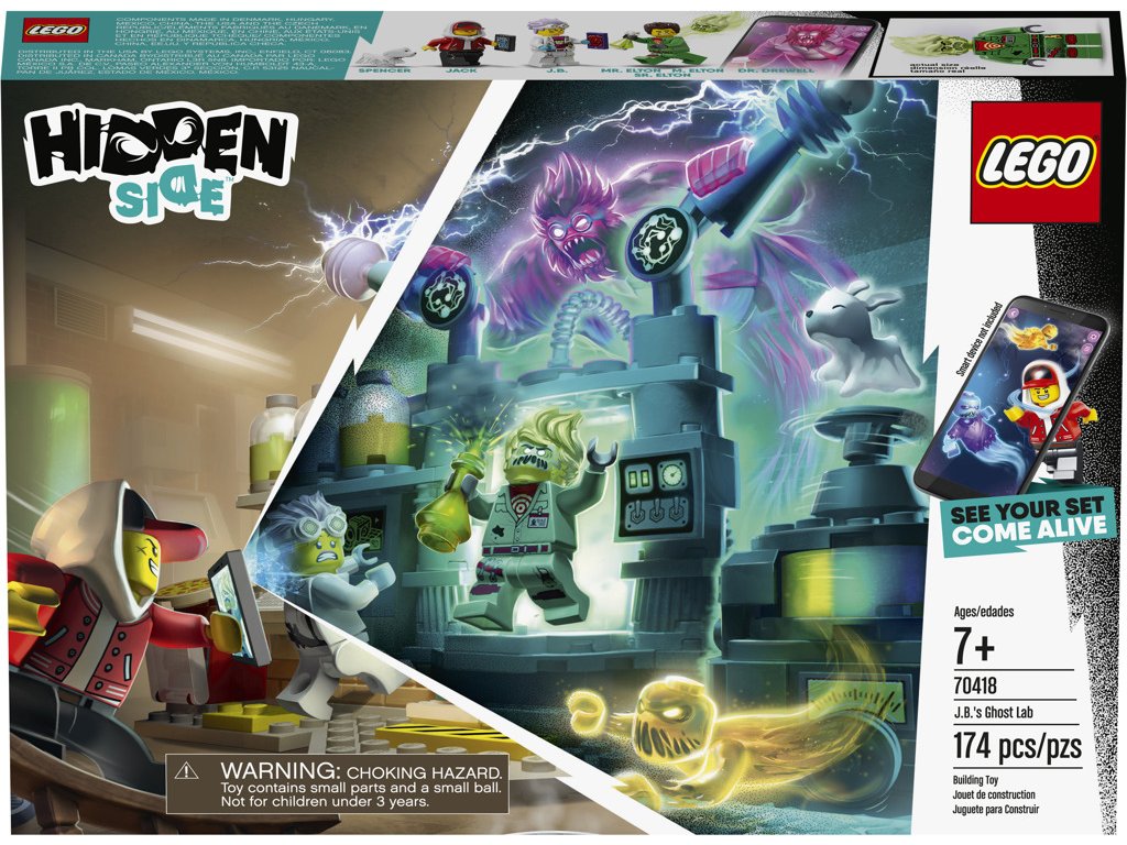Dopřejte svým malým stavitelům napínavé dobrodružství v rozšířené realitě se sadou LEGO® Hidden Side™ 70418 J. B. a její laboratoř plná duchů. Hidden Side přináší nový vzrušující způsob hraní s LEGO stavebnicemi v kombinaci s aplikací pro plně interaktivní zážitek. Stáhni si aplikaci Hidden Side, naskenuj model pomocí telefonu a přiveď stavebnici k životu. Spojení modelu s aplikací přináší zcela nový způsob hraní. Díky průběžným aktualizacím, novým záhadám k řešení, předmětům k nalezení, duchům k chycení a silným šéfům duchů k udolání přináší sady LEGO Hidden Side zbrusu nový herní zážitek! Laboratoř J. B., ve které se to duchy jen hemží, nabízí spoustu úžasných technických prvků a laboratorních doplňků jako ze skutečného světa, jež podněcují k nápaditému hraní. Děti si zamilují stavění laboratoře a naplno si užijí napínavé dobrodružství při hraní v aplikaci, kde se pokusí chytit ducha, který posedl uklízeče. Součástí jsou i minifigurky hrdiny, uklízeče, vědkyně a figurka roztomilého pejska ze záhrobí, se kterými si můžeš přehrávat nespočet příběhů.