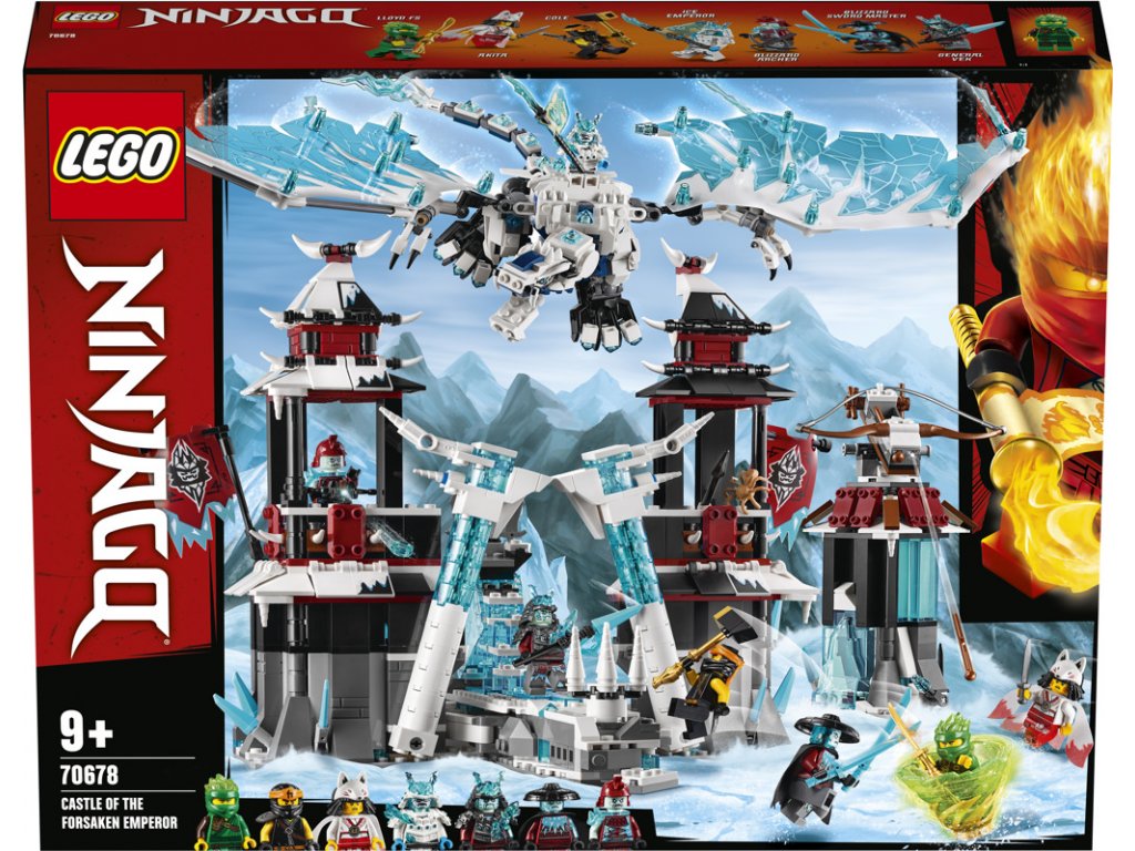 Přehrávej si nindža bitvy proti ledovému císaři, generálu Vexovi a sněžným samurajům s touto sadou s ledovým hradem pro kluky a holky. Sada 70678 Hrad zapomenutého císaře od LEGO® NINJAGO® obsahuje trůn ledového císaře s funkcí odhalení trůnu, 2 věže – z toho 1 s vystřelovací kuší – a samostatnou ledovou věž s pružinovým vystřelovačem a otevíracím ledovým vězením. Děti si zamilují přehrávání scén z TV seriálu NINJAGO a vymýšlení vlastních příběhů se 7 minifigurkami, pohyblivým ledovým drakem a spoustou parádních zbraní a doplňků, včetně svitku zapovězeného Spinjitzu ledového císaře a tornádo spinneru Lloyda FS, který představuje novinku pro červen 2019.