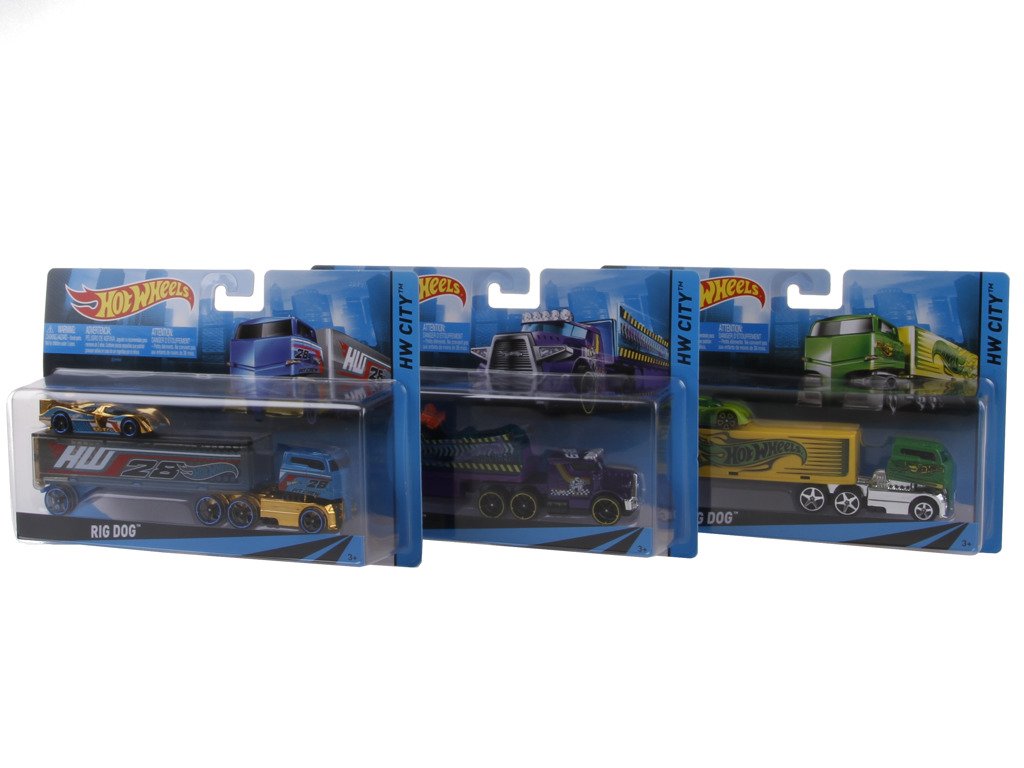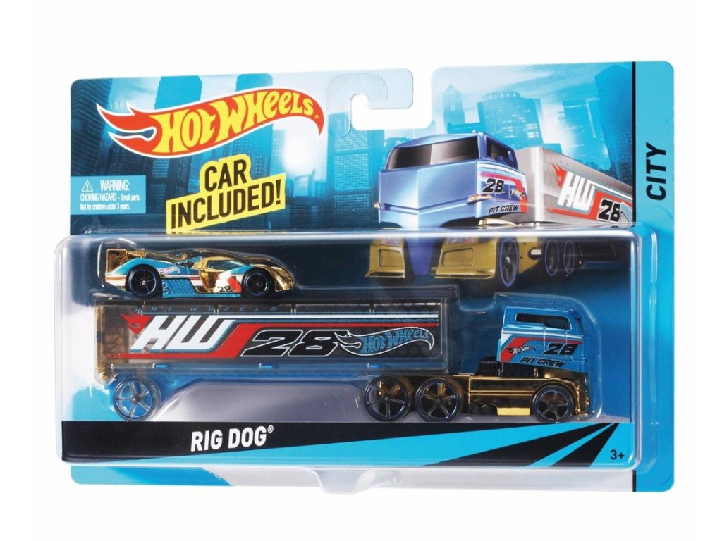 Hot Wheels Náklaďák. Tyto parádní náklaďáky Hot Wheels nabízejí inspirativní způsoby hry. Dají se posouvat kolem, naložit a vypravit na cestu nebo postavit na závodní dráhu! Každá souprava se dodává se sportovním autíčkem a nabízí spoustu akční zábavy a dynamické detaily. Podívej na černý náklaďák s červeným okrajem, parádními „chromovanými“ trubkami a odhaleným motorem, který se dodává se suprovým modrým závoďákem. Nebo si vyber zelený náklaďák s ocelově stříbrnou lebkou, s obložením se zelenými plameny a obrovskou lebkou a hnáty, které drží retro světlomety.