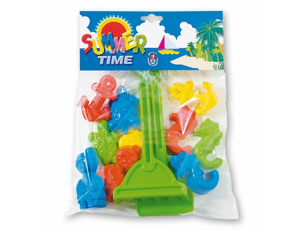 Sada na písek s mořskou tematikou. Obsahuje: Lopatku, hrabičky a tvořítka na písek různých tvarů. Vyrobeno z kvalitních plastů v Itálii. Baleno v sáčku o rozměrech 27 x 34 cm. Váha: 0,23 kg.