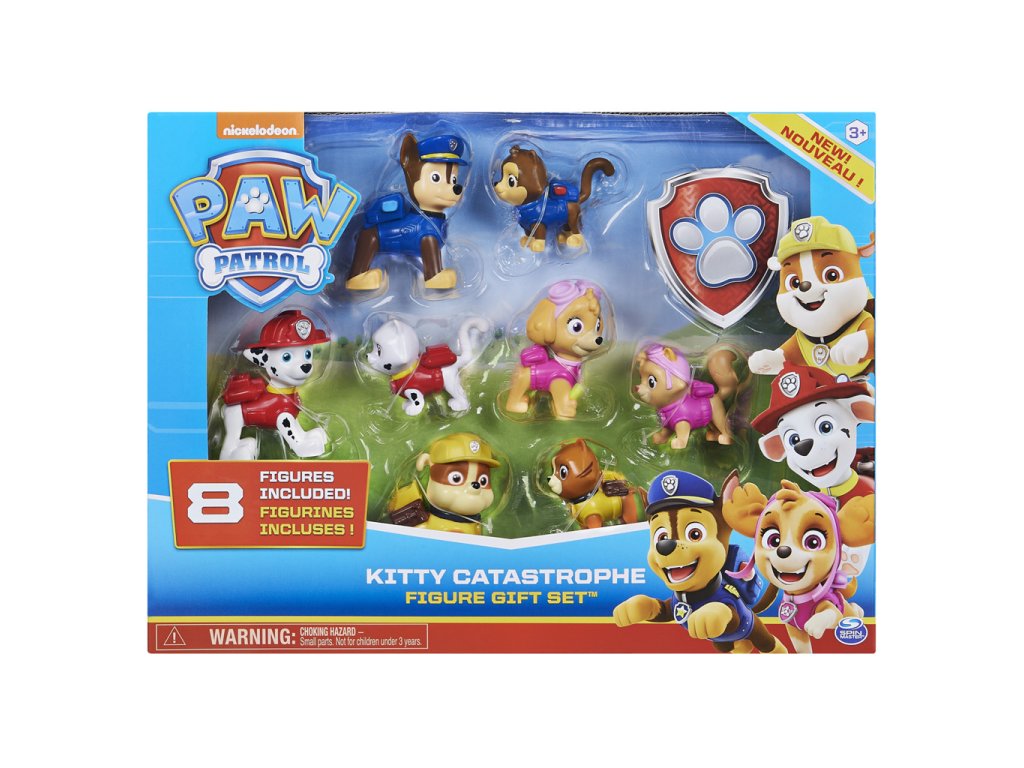 Přines si domů sadu figurek Tlapkové Patroly a jejich záškodnickými kopiemi z Kočičí Katastrofy v dárkovém balení 8 figurek s doplňky. Tento set musí mít každý opravdový fanoušek Tlapkové patroly a spolu s ním přichází 8 sběratelských postaviček. Okamžitě přidej Chase, Marshalla, Rubble, Sky a rozpustilé koťata z Kočočí Katastrofy do své sbírky figurek Tlapkové patroly. Každá figurka, oblečená do klasické uniformy, dokáže díky detailům všech doplňků přivést postavy ze seriálu k životu. Přidej se ke svým oblíbeným členům Tlapkové Patroly a Kočičí Katastrofy na jízdu za nekonečným dobrodružstvím.